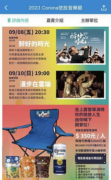 最近Daniel就參加了活動通上的戶外電影活動「2023 Corona 弛放音樂節,弛放影展-漫步在雲端」