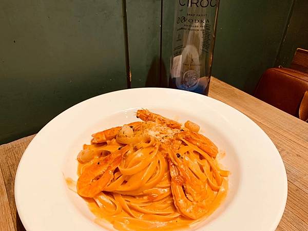 "鮮蝦干貝茄汁奶油寬麵"的醬汁風味非常濃烈,不過可能是寬義大利麵的關係
