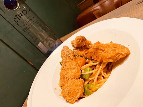 "泰式酸辣炸雞柳條麵"酥脆口感,與其說是炸雞柳條,不如說是無骨炸雞排