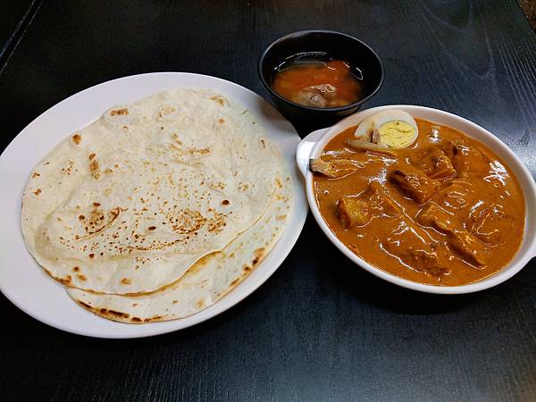 店內的人氣招牌餐點"新加坡咖哩G腿"搭配烤餅