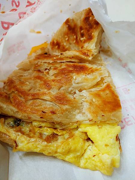 從蔥油餅中流出了溫熱的起司