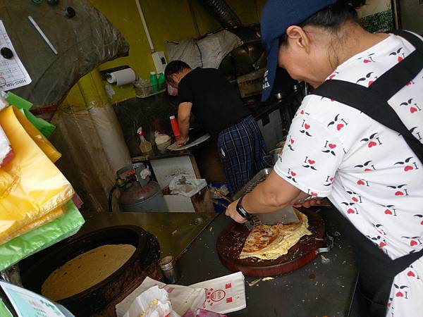 老闆桿著蔥油餅的麵糊,老闆娘負責把煎好的蔥油餅切好裝袋