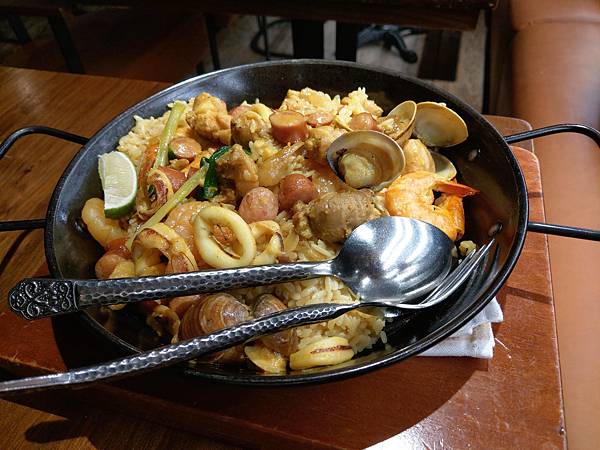 滿滿的海鮮佐料,直接放在鐵鍋中端上的海鮮燉飯,
